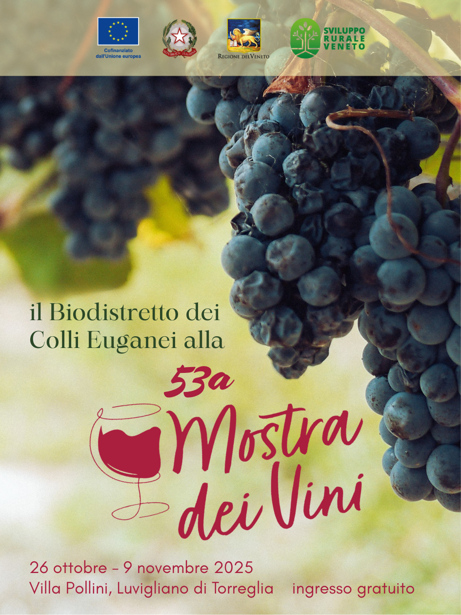 Il Biodistretto della Produzione e della Comunità del Biologico dei Colli Euganei partecipa alla 53ª Mostra dei Vini di Luvigliano, ospitata a Villa Pollini dal 26 ottobre al 9 novembre 2025. Per tutta la durata dell’evento sarà presente uno spazio informativo che invita il pubblico a esplorare il rapporto tra viticoltura biologica, territorio e qualità, per orientare scelte più consapevoli.