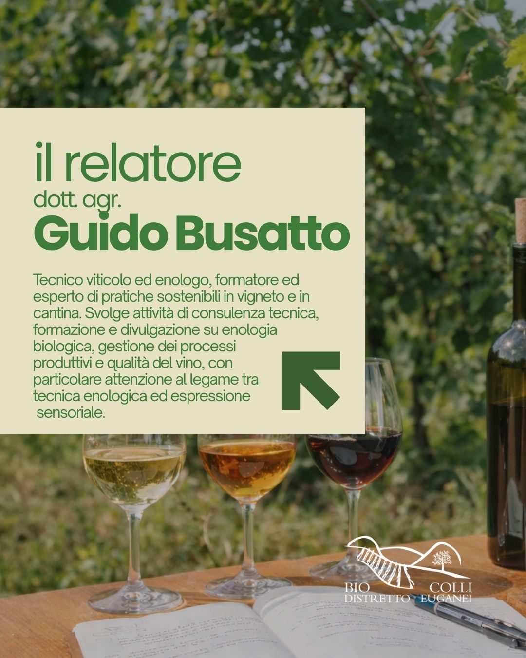 Il seminario sarà condotto dal Dott. Agr. Guido Busatto, tecnico viticolo ed enologo, formatore ed esperto di pratiche sostenibili in vigneto e in cantina.